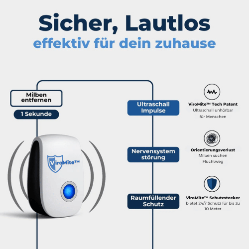 ViroMite™ wehrt nicht nur bestehende Milben ab, sondern hilft auch, neuen nBefall zu verhindern, indem es eine unbewphnbare Umgebung für sie schafft. Durch die kontinuierliche Aussendung von Ultraschallwellen schützt es deinen Raum 24/7 und erschwert es Milben, zurückzukehren oder sich auszubreiten. Um beste Ergebnisse zu erzielen, lasse ViroMite™ immer angeschlossen und verwende es in mehreren Räumen, um eine vollständige Abdeckung zu gewährleisten.